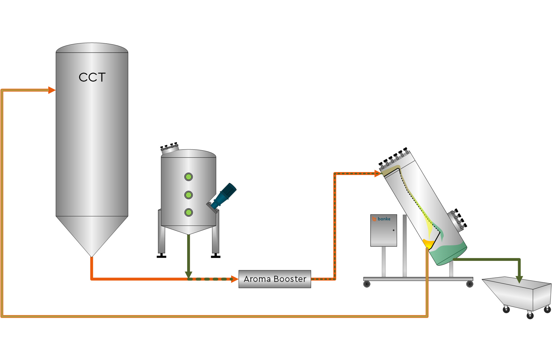Zusätzliche Vorteile bietet die HopSteiner Technologie in Kombination mit dem Loopulator. Analog zum LoopulEX System kann hiermit ein externes Dry Hopping mit Feststoffrückhaltung im Bypass realisiert werden. Der Hopfen wird vollständig ausserhalb des Tanks extrahiert und die Feststoffe nachfolgend abgeschieden. Damit ergeben sich weitere Einsparpotentiale und Prozessmöglichkeiten - beispielsweise bei der Verwendung von neuartigen Hefestämmen für alkoholfreie Biere.